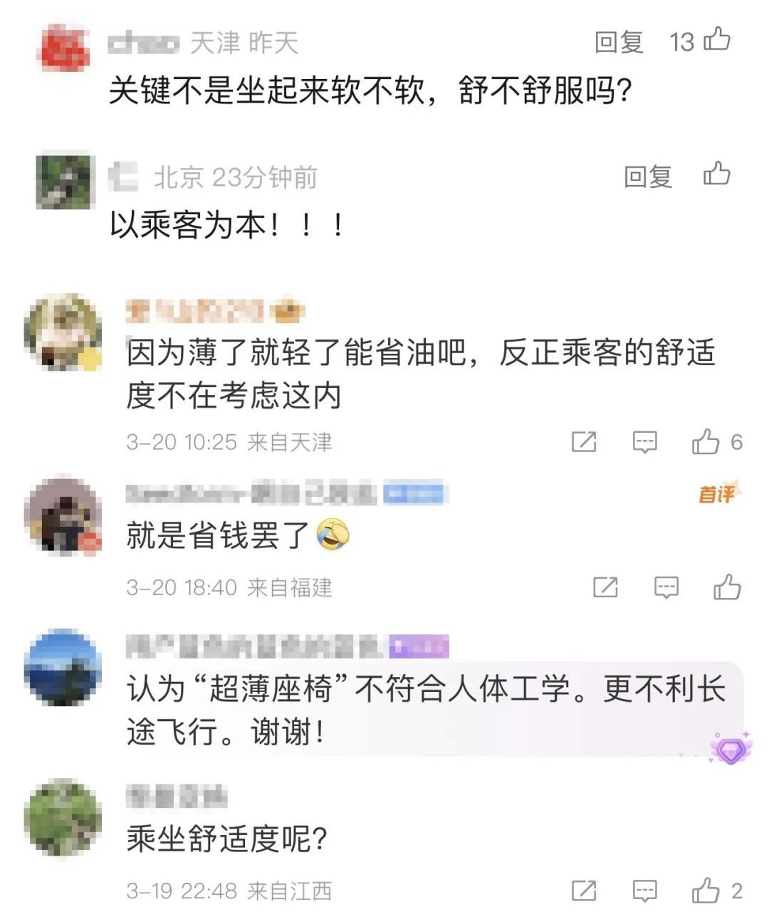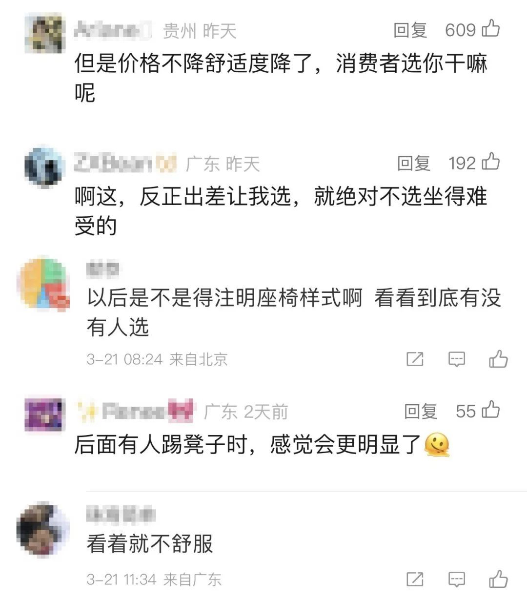 航司认为“符合人体工学设计”的“轻薄型座椅”,于乘客而言却是“硬座”“硌得慌”。座椅是否舒适,乘客最有发言权。节能环保、降本增效,以及旅客的乘坐体验,任何时候不该是非此即彼的单选题。