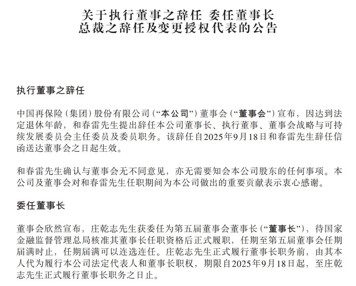 9月18日晚间,中国再保险(集团)股份有限公司(下称“中国再保”)发布公告称,因达到法定退休年龄,和春雷辞任公司董事长、执行董事、董事会战略与可持续发展委员会主任委员及委员职务。